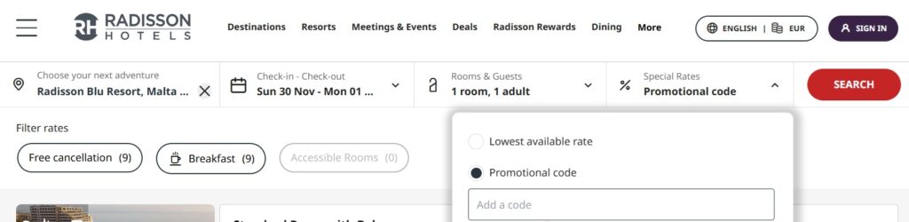 Hereunder is a screenshot showing where to input the promo code recieved by email when booking in one of the hotels.